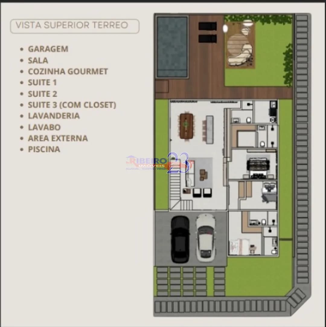 SALA, ÁREA GOURMET, LAVABO, ÁREA DE SERVIÇO, 4 SUITES SENDO 2 COM CLOSET, TERRAÇO, PISCINA, GARAGEM PARA 4 CARROS SENDO 2 COBERTOS E 2 DESCOBERTOS . OBS: Móveis planejados e decoração ( projetos ilustrativo).